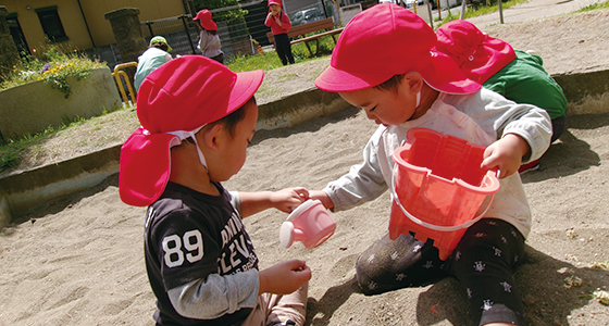 穏やかな保育園生活の中、子どもたちは伸び伸びと遊んでいます。周りに公園も多く、散歩に出かけては芝生の上を走り回ったり、砂場や遊具で遊んだりしています。