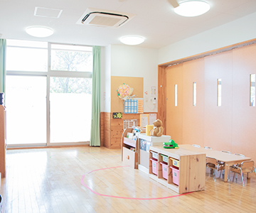 保育室全体が木目を基調とした明るい環境になっており、あたたかな家庭的な雰囲気の中で、年齢の異なる子どもたちとの交流も楽しく行われています。