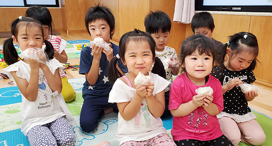 リズム運動やわらべうたの遊びを通し心も身体をしなやかにたくましく育ってほしいと考えています。