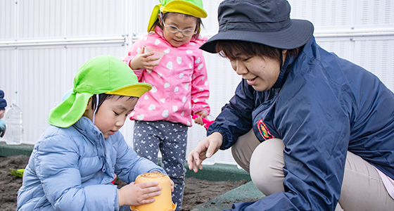 保育園では、一人ひとりの年齢や月齢に合わせて、多くの経験ができるような環境を整えています。さらに、成長のスピードが異なる子ども達一人ひとりの声に耳を傾け、それぞれの個性を大切にし、子ども達に寄り添った保育を心がけています。