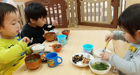 保育園は、子どもにとっての時間が豊かに刻まれる場所です。心地良く、安心でき、自分をありのままに受け留めてくれる大人がいることで、「愛されている」「必要とされている」ことを感じてほしいと思っています。初めての発見や経験を積み重ねるなかで、自然や自分や人を好きになり、豊かな感性と表現力が育まれるようにと見守ります。感じることや目に見えないものを大切にし、相手の心にも気づいて認められるように、毎日の生活や遊びのなかで、心の基礎を築いていけるのではと思っています。喜んだり、悲しんだり、悔しがったり、考えたりを繰り返しながら、おいしい給食でエネルギーチャージ!健康でたくましい体づくりに努めます。